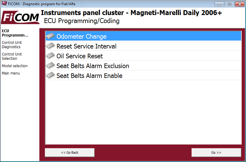 A „Kilométer-számláló módosítása” funkció az „ECU programozás/kódolás” menüben található, miután csatlakoztatta a műszerfali vezérlőegységhez.